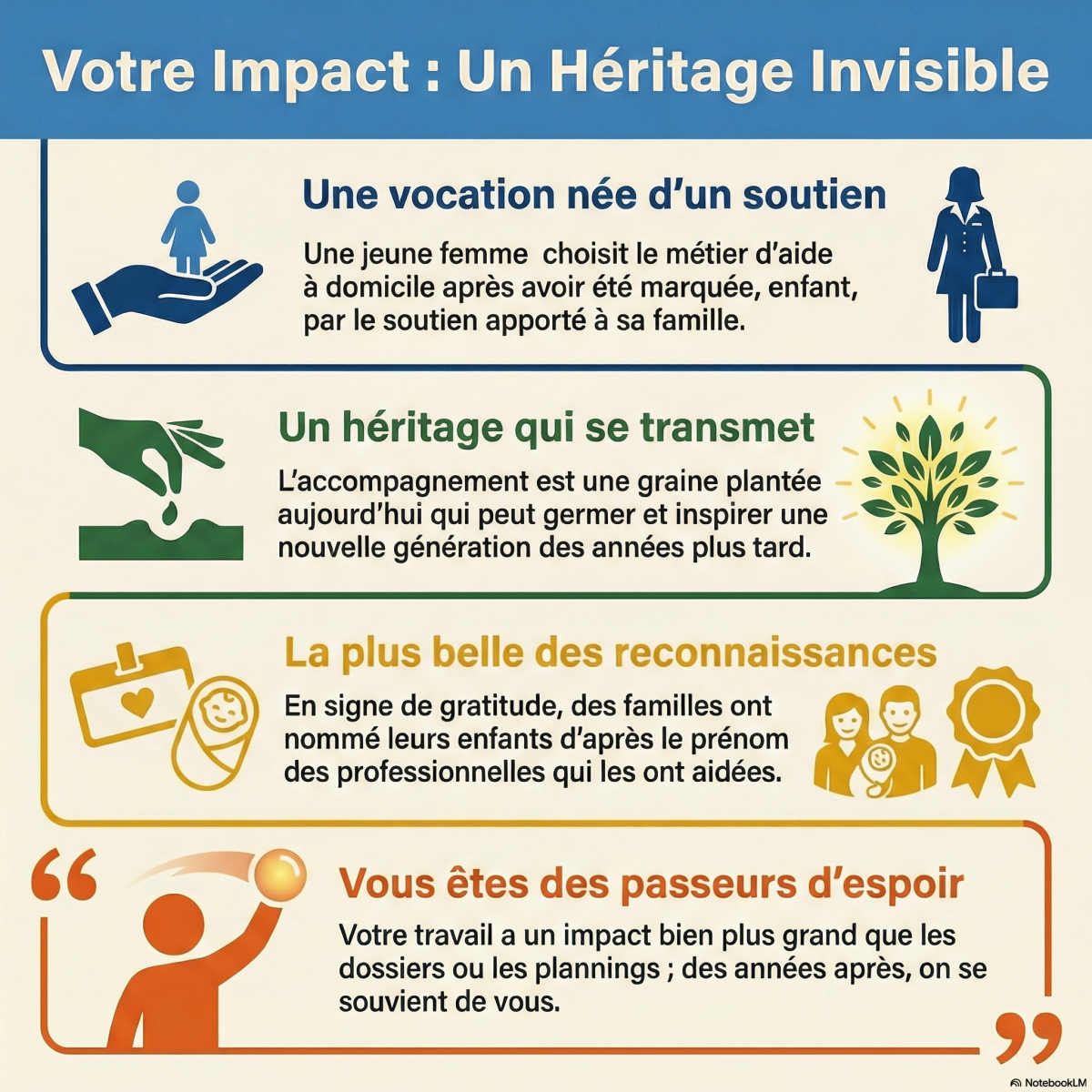 📢 À tous les professionnels du domicile, du social et du médico-social : Votre travail a un impact bien plus grand que les dossiers, les plannings ou les rapports. Vous êtes des passeurs d’espoir, et des années après, on se souvient de vous.
